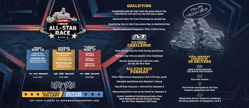 “We’ve listened to our fans and worked closely with NASCAR to create a format that blends the tradition of a typical race weekend at The Monster Mile with the excitement and unpredictability that make the All-Star Race so special,” said Mike Tatoian, president of Dover Motor Speedway. “This format rewards performance, puts every driver on track on Sunday, and shines the spotlight on what Dover does best with high speeds and high levels of excitement. It’s going to make for an unforgettable All-Star Weekend!”